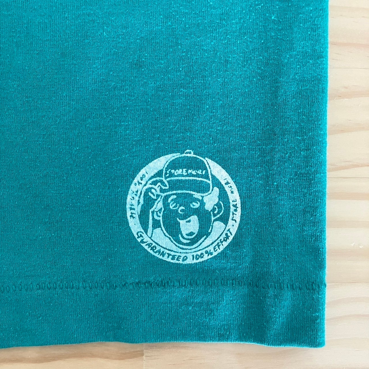 裾口にストア森ロゴ(かすれプリント加工)が入ります。