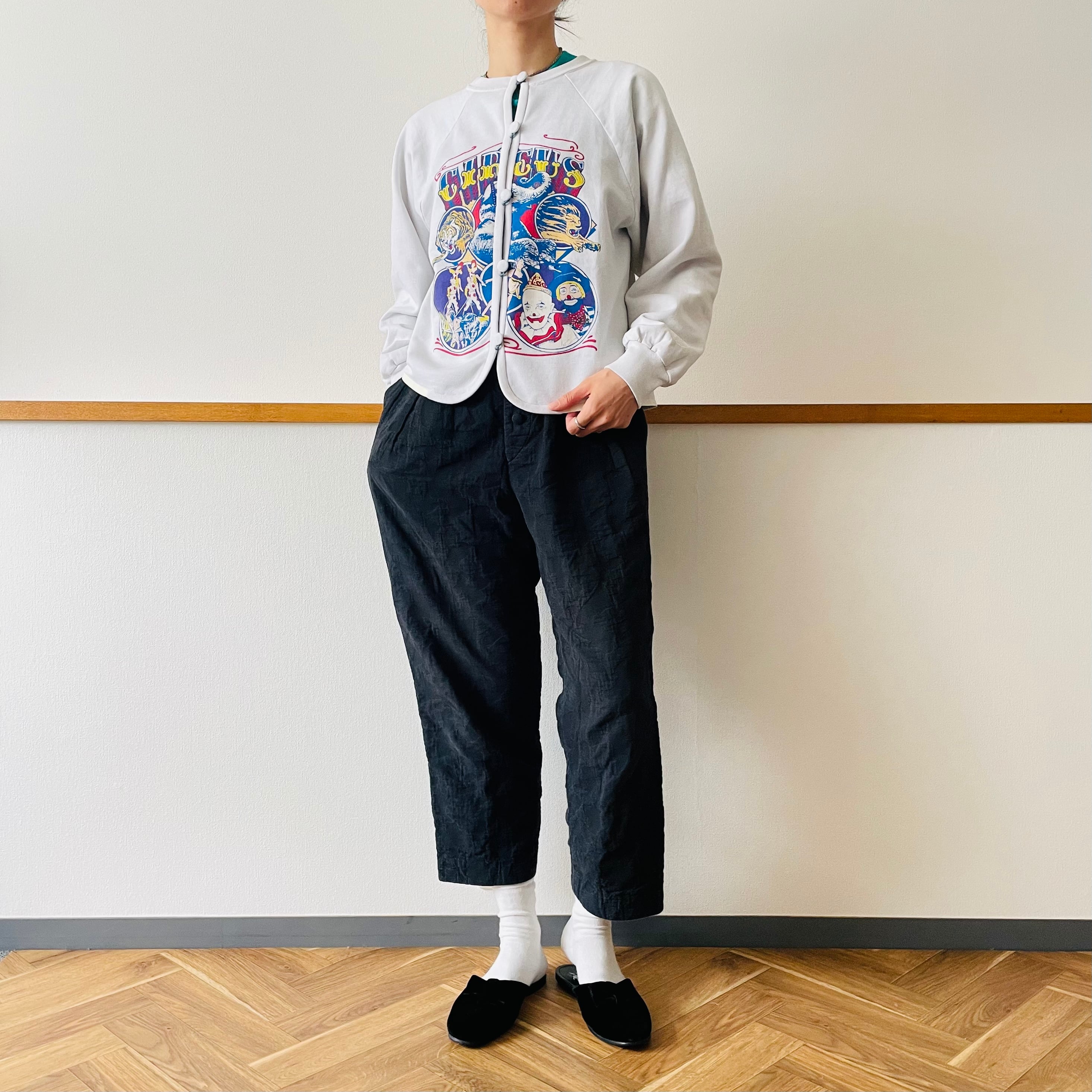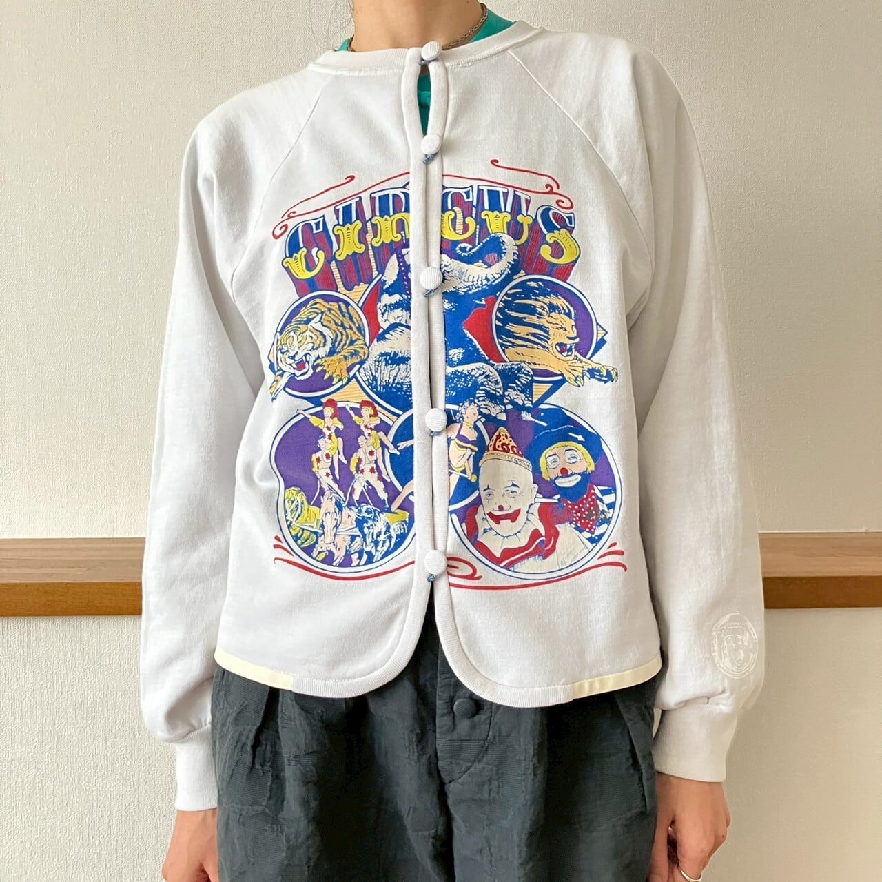 80年代頃と思われる、サーカス団をテーマにしたラグランスウェット。虎、ライオン、象、ピエロ、アクロバットが描かれた、まさにサーカスの世界が詰まった一枚です。