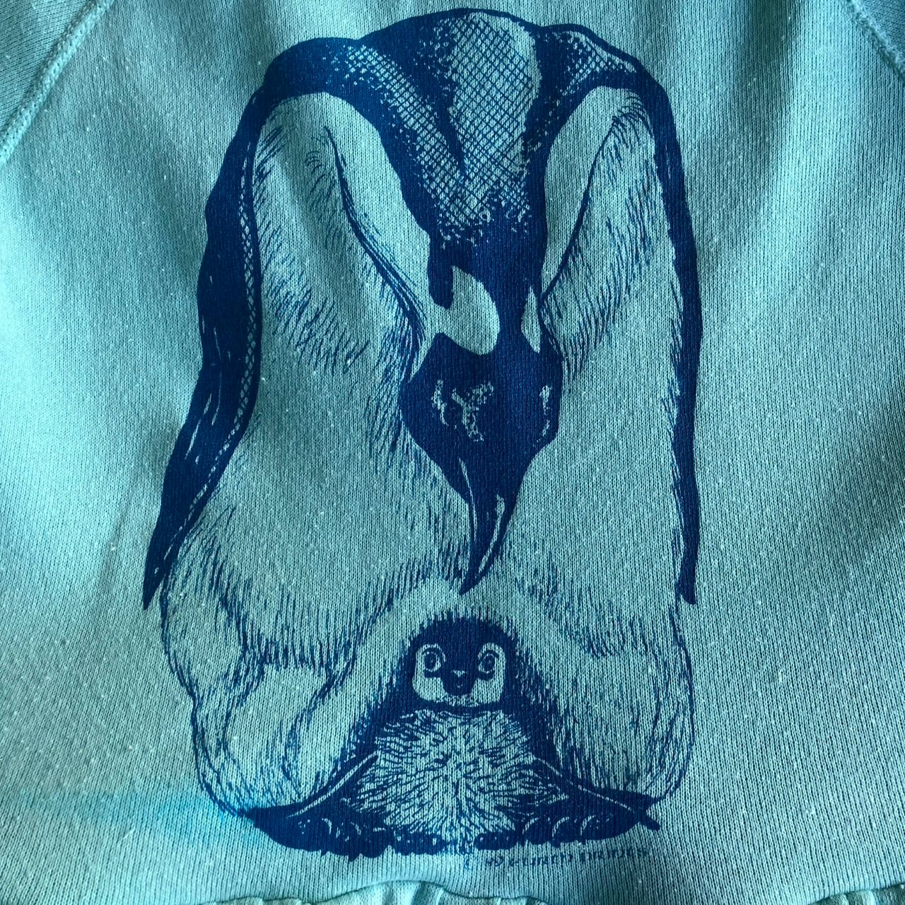 優しいミントグリーンのボディに、親子の皇帝ペンギンを細やかなタッチで描いたデザイン。
