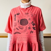 動物ごとの“フィールドサイン(フンの形状)”を図鑑のように並べたユニークなデザインで、学術イラストレーターによる細密なタッチが魅力です。淡いピンクのボディにブラックプリントが映える、洒落感と遊び心のある一枚。