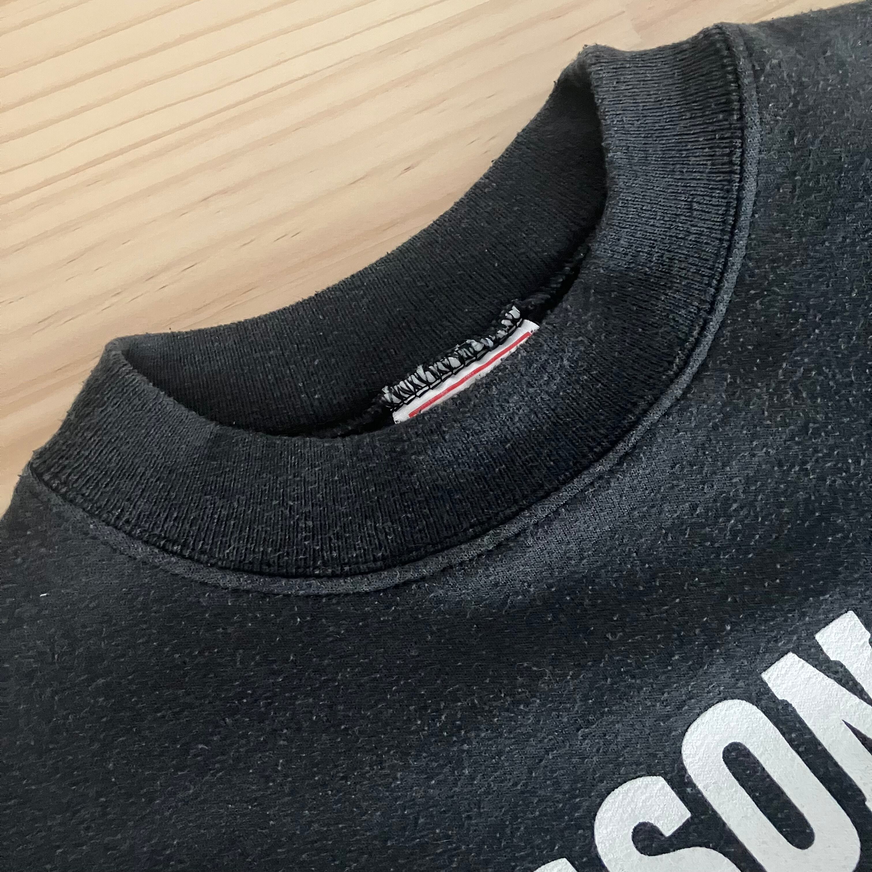 学術ポスターのような構成がユニークで、カルチャースウェットとしても完成度の高いデザインです。ボディはやや厚みのあるコットン混素材で、プリントの発色も良好。内容とデザイン性のバランスが取れた一枚です。