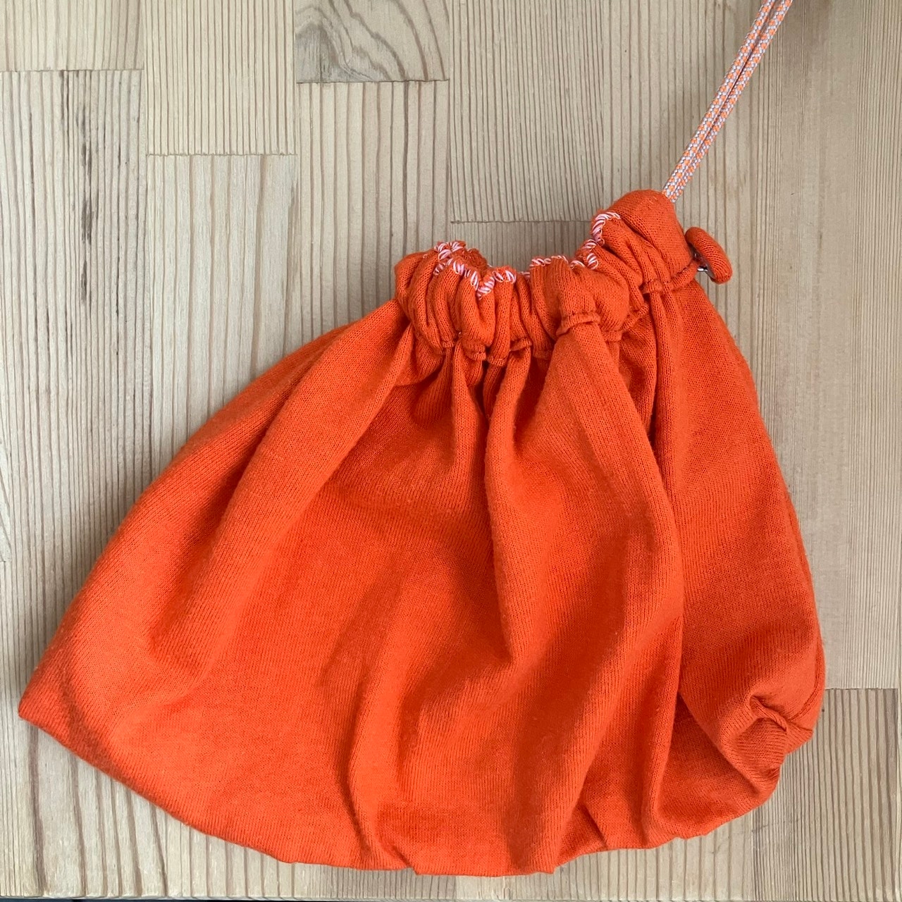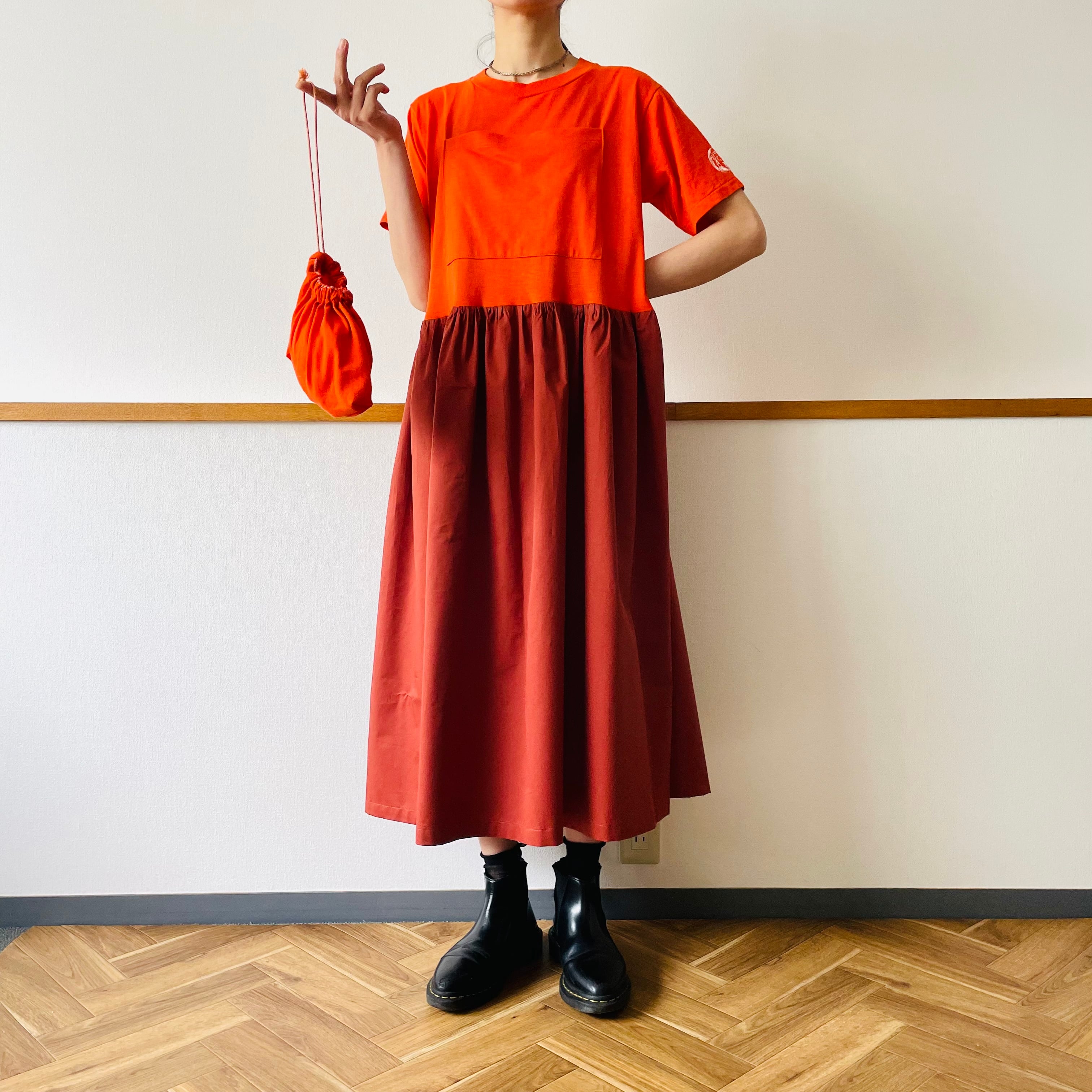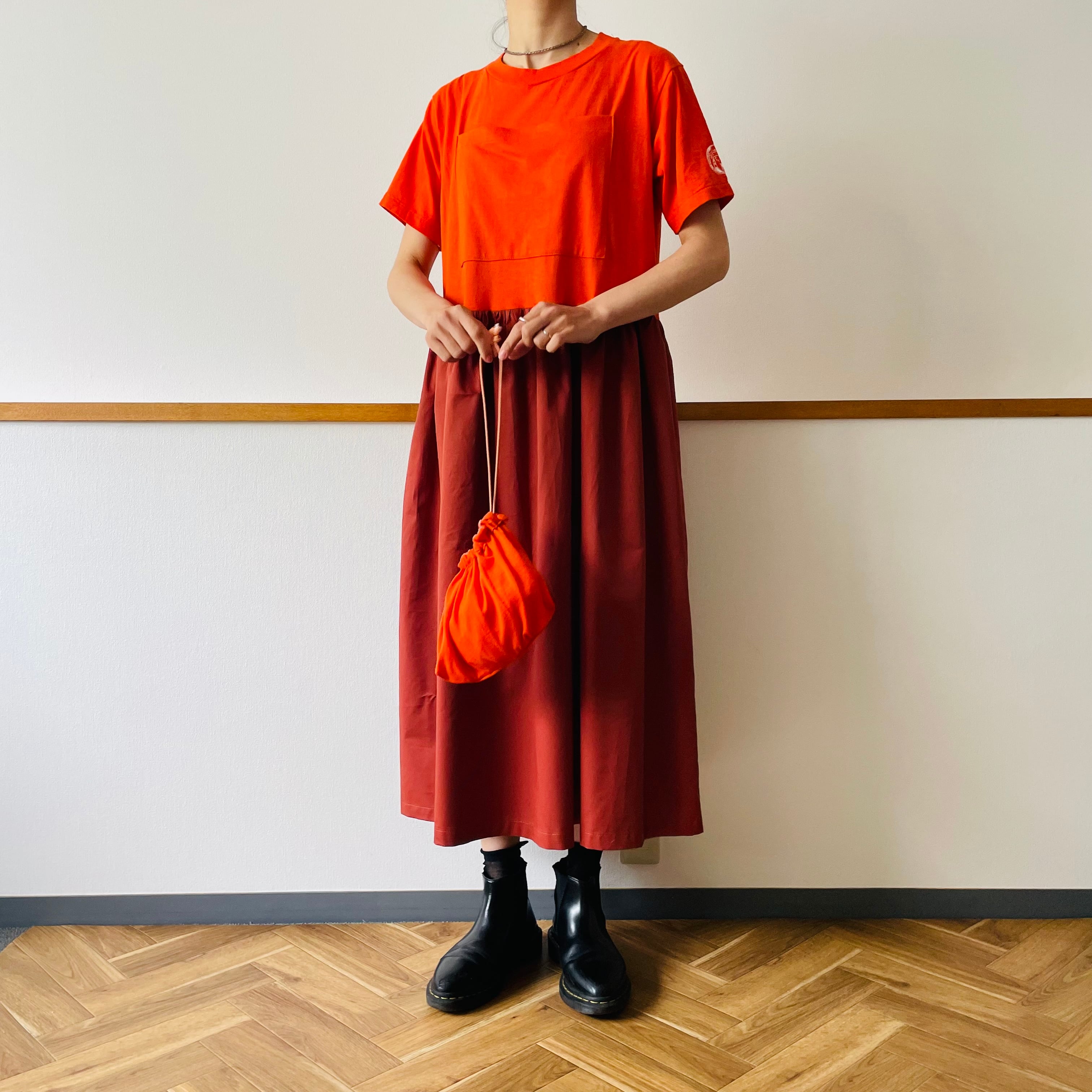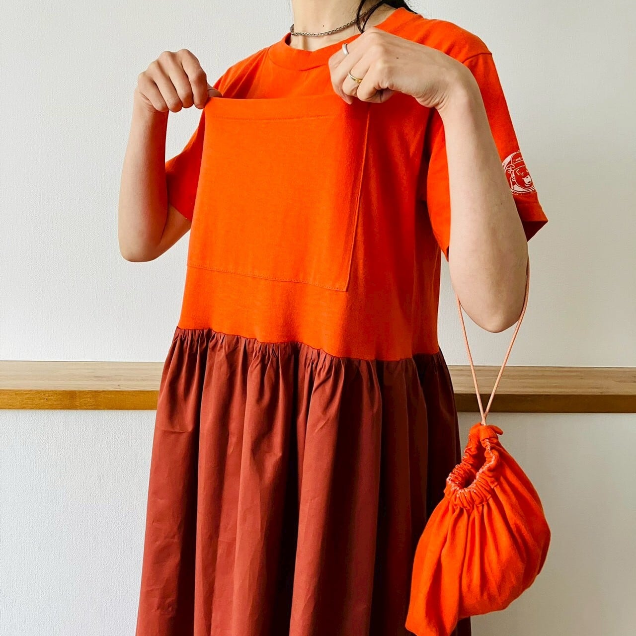 カットした部分を利用してフロントに大きなポケットとセットの巾着をプラス。
