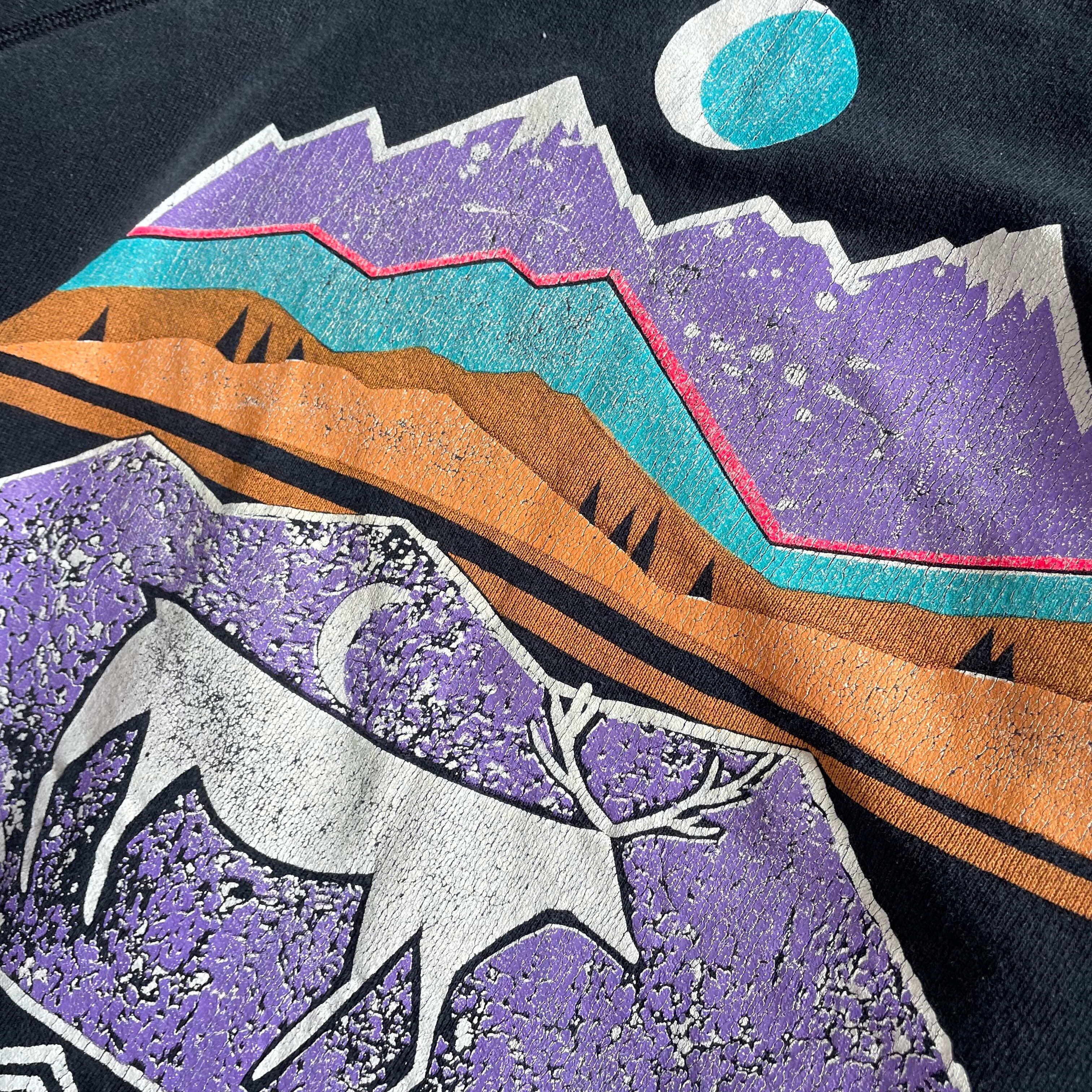 プリミティブなタッチで描かれた、野生のシカ・山脈・月。「国破れて山河あり」、人間の営みがちっぽけに感じます。